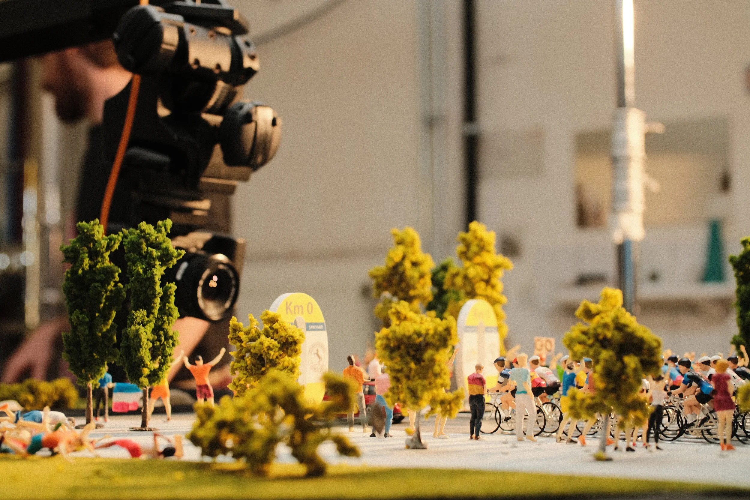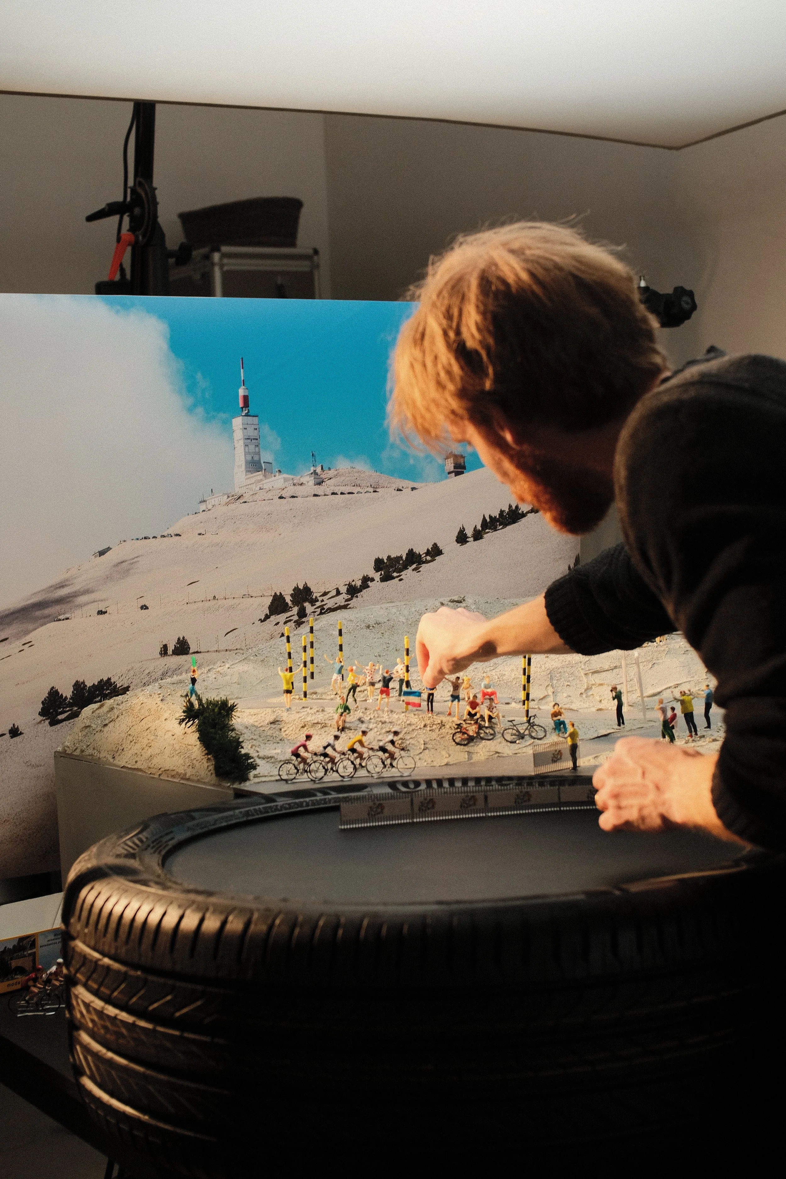Together with Golazo Brands we created a setting with the tyre in the center of the differents Tour de France worlds where the stop motion action takes place. This set-up was created in a way so that the tyre is clearly visible in different shots throughout the video and in the end shot, which reveals the whole ‘tiny world’.